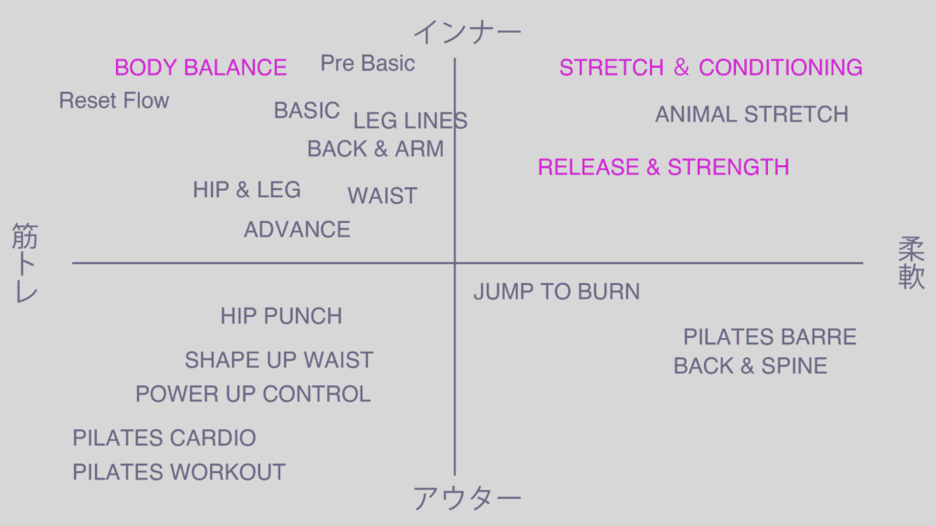 アウターマッスルが強いと苦手意識が芽生えるレッスン。バランスよく鍛えていきたい場合、BODY BALANCEを定期的に受けた方がいいといっても過言ではないです。