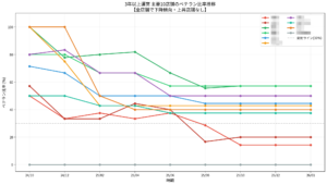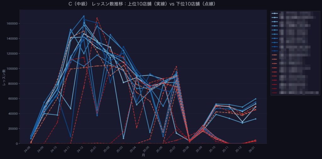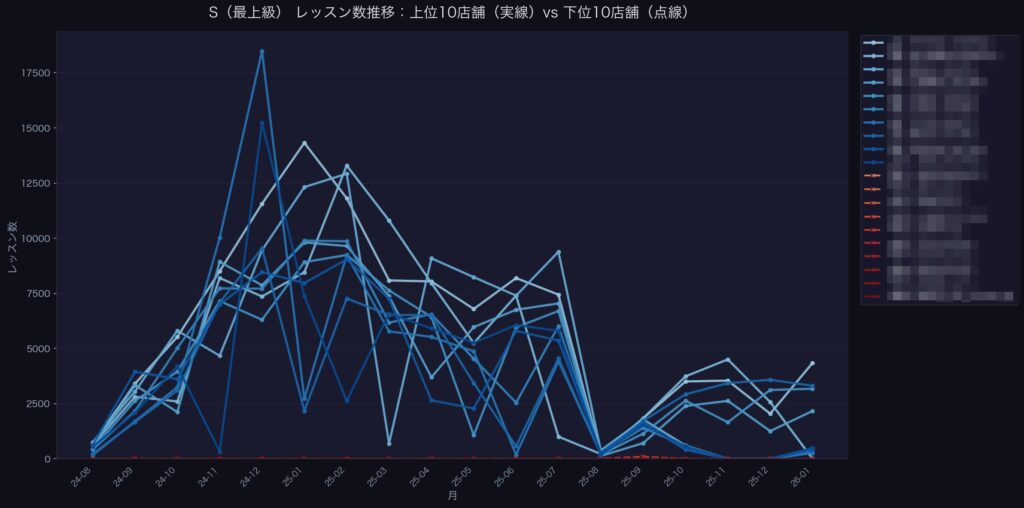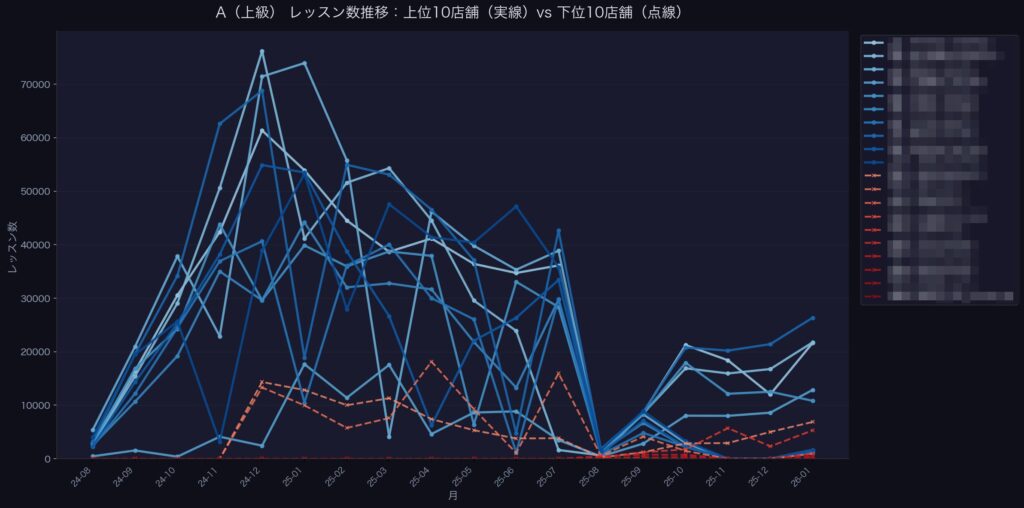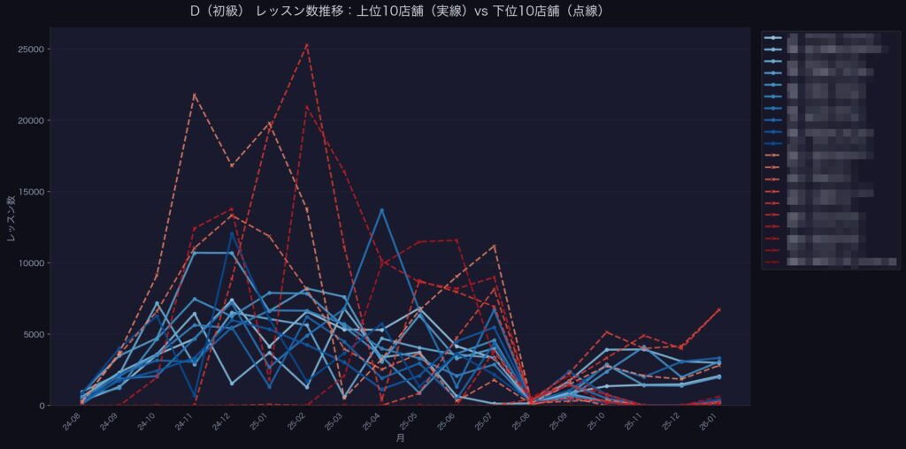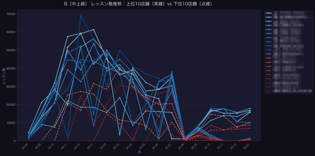 上記のように点線が導入したが流入が少ない店舗、実線が流入が多い店舗になります。店舗の責任ではないため本部より責任転嫁されないようにマスキングさせていただいていますが・・・点線の導入したが流入が少ない店舗はオープンから1年満たないスタジオが多いという結果となっています。つまりは、まだ、店舗ごとの顧客のレッスン習熟度が高くないということの証明となっている以前に、インストラクターの離職率の記事でもわかる通りハード系保持インストラクターはベテランが圧倒的に多いため、地方にベテラン勢を配置しているため都内でのハード系が減っていくという謎事象が発生することになる。中にはインストラクターの諸事情により異動が発生することもあるだろうが、果たして全員が地方を希望するだろうか。