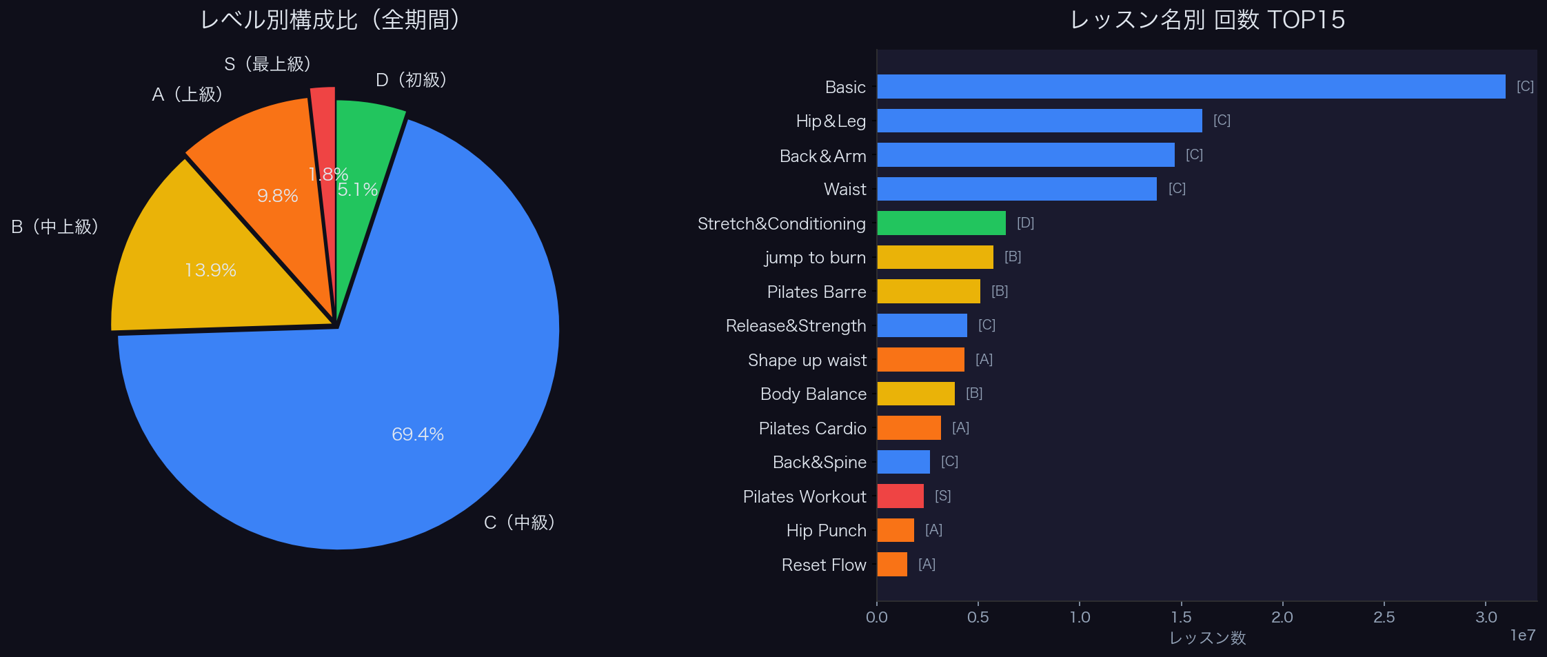 レッスンの割合を見てみると圧倒的にベーシックの割合が多い。常連のステップアップができないというのがこのデータで見てみるとわかるかと思います。ただし、ここ数年のスタジオを急激に増やしたため、レッスンの導入がBasic系になってしまっているのではと指摘を受けそうですが・・・。