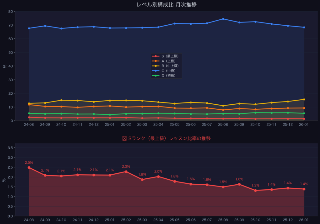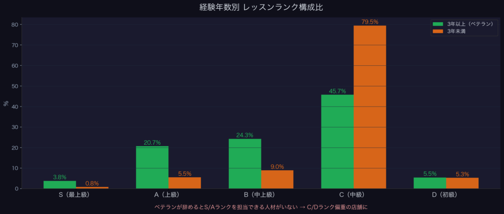 では、インストラクターの経験年数とレッスンランクの構成を見てみると、上記のレベル別構成比と離職で穴が空いている状況が伺える。つまりは、難易度が高いレッスンができないインストラクターしか在籍していないと言われてもしょうがない状況を産んでいる。