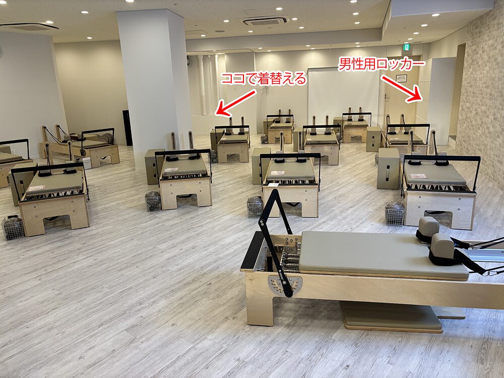 更衣室は?更衣室は、スタジオの中で現在着替えるようになっているようです。また、男性用ロッカーもレッスンスタジオ内にあるとのことでした。古いですがスーパージョッキーの生着替えみたいになってて、ちょっとお互い気まずいような・・・。着替え終わった女性の方がマシンのセットアップやストレッチをやっているところで着替えるってちょっと意味がわからないなと思っています。
